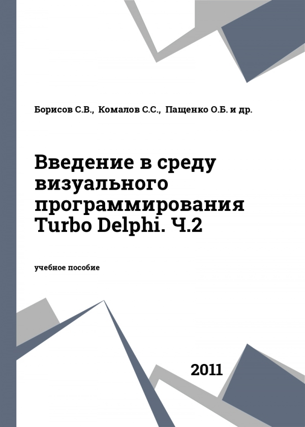 Введение в среду визуального программирования Turbo Delphi. Ч. 2 : учебное пособие / Борисов С. В., Комалов С. С., Пащенко О. Б. [и др.] ; ред. Трусова Б. Г. - Московский государственный технический университет имени Н. Э. Баумана, 2011.