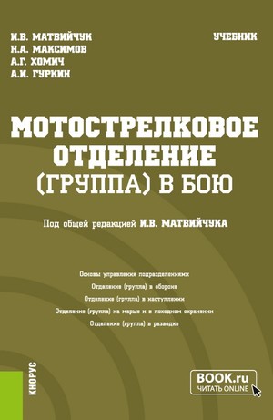 Мотострелковое отделение (группа) в бою : учебник / И. В. Матвийчук, Н. А. Максимов, А. Г. Хомич [и др.] ; под общ. ред. И. В. Матвийчука. — Москва : КноРус, 2026. — 334 с. — ISBN 978-5-406-16456-3.